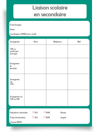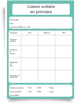 Le groupe des enseignants du RiIFHOP a collaboré à la réalisation du classeur de liaison RIFHOP. Ils ont conçu les deux fiches de liaison scolaire. Elles seront utiles pour faire le lien entre les différents enseignants de l'élève en soins : ceux de l'hôpital, ceux de l'établissement et ceux qui interviennent au domicile.